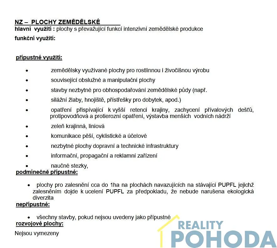 V současné době se jedná o louku bez nájemního vztahu. V územním plánu obce je pozemek veden jako NZ PLOCHY ZEMĚDĚLSKÉ.