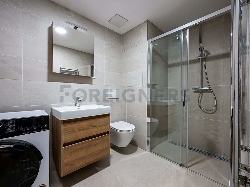 Koupelna kombinuje sprchový kout s toaletou, nechybí zde pračka se sušičkou a topný žebřík. Pokoje jsou vybaveny klimatizací a podlahovým topením, které zajišťuje komfort po celý rok. V ložnici se nachází vestavná skříň. Podlahy tvoří kombinace vinylu a keramické dlažby, okna jsou plastová a doplněná elektrickými žaluziemi.
