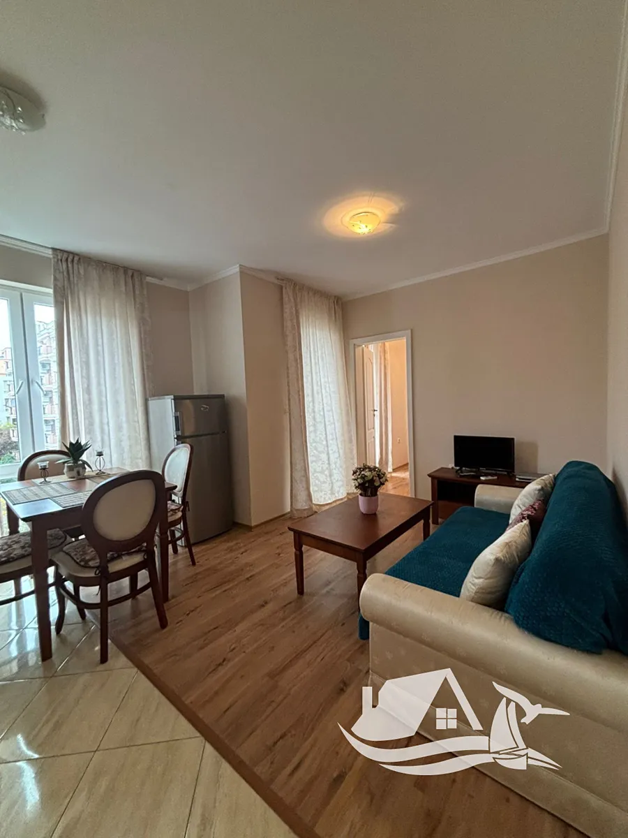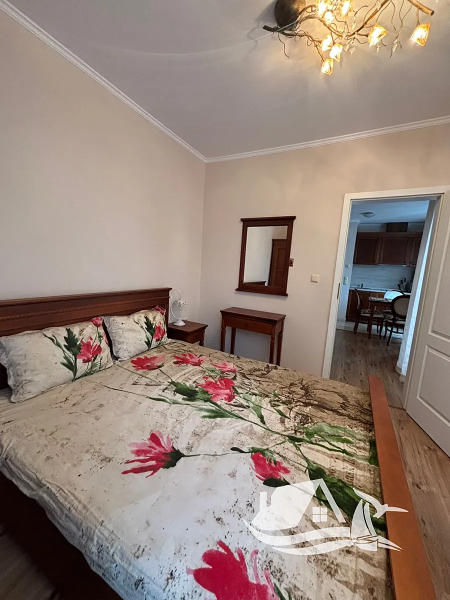 Kuchyň je vybavena spodními a horními skříňkami, dřezem, dvouplotýnkovým sporákem, digestoří, volně stojící lednicí a jídelním stolem se čtyřmi židlemi. V obývacím pokoji najdete pohovku, konferenční stolek, komodu, televizi a klimatizaci. Ložnice je zařízena manželskou postelí, nočními stolky, toaletním stolkem se zrcadlem a prostornou šatní skříní. Koupelna je elegantně obložena a disponuje sprchovým koutem, umyvadlem a toaletou. Na terase je k dispozici stůl se dvěma židlemi, ideální pro večerní posezení.