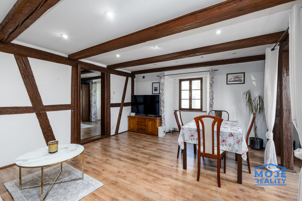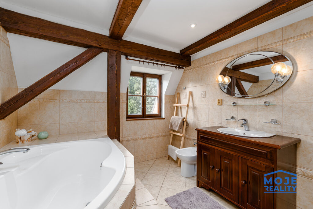 renovované dřevěné podlahy, nová okna (trojskla), kompletní renovace dřevěných trámů, koupelen i zázemí