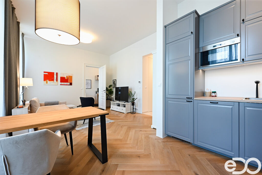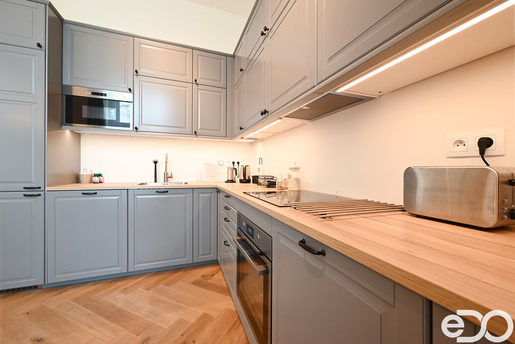 - Kuchyňská linka na míru vybavena elektrickou indukční varnou deskou, horkovzdušnou elektrickou troubou, digestoří, vestavnou lednicí, myčkou a pračkou.