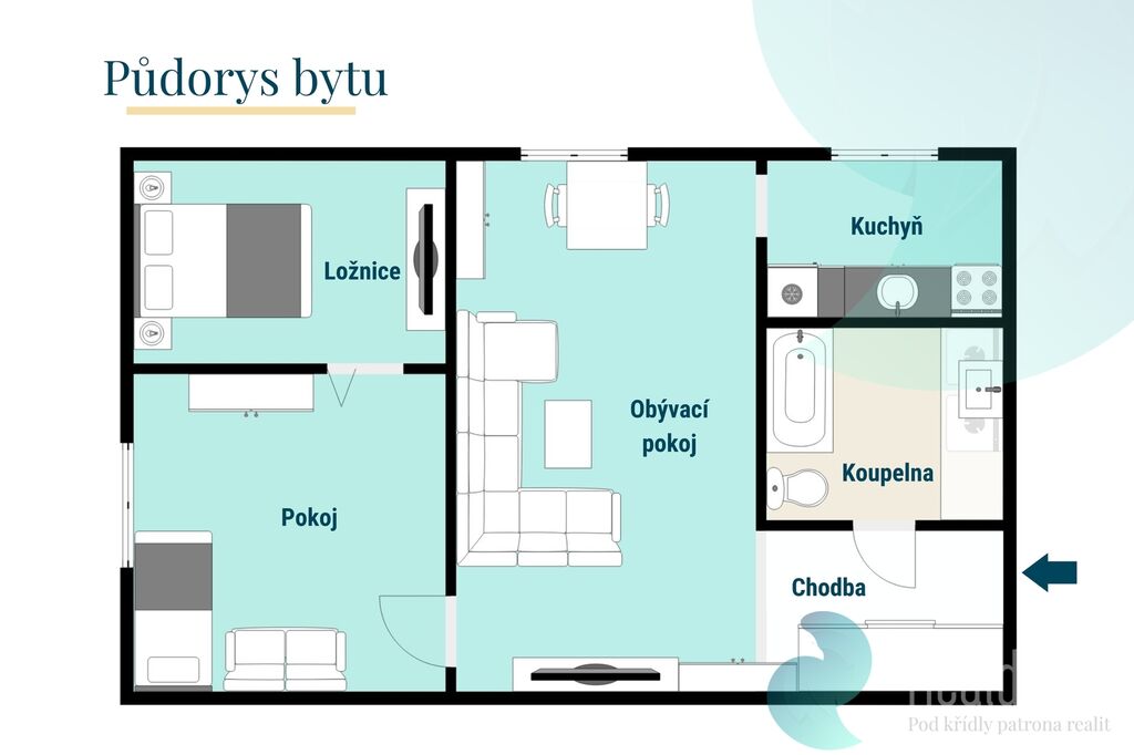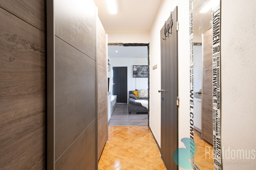 Po vstupu do bytu chodba s vestavěnou skříní. Chodba je spojena s otevřeným a prostorným obývacím pokojem a kuchyní. Vkusná, moderní koupelna s vanou. Za obývacím pokojem je samostatný, přepažený pokoj, odkud je vstup do ložnice.