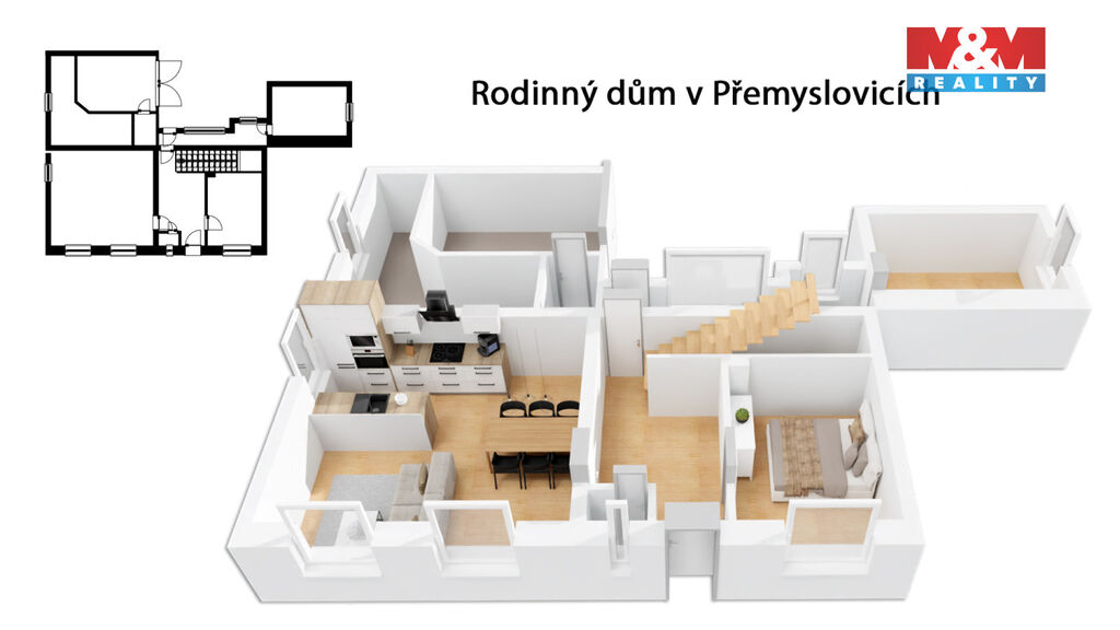 Nabízíme k prodeji rodinný dům po rozsáhlé rekonstrukci v klidné části obce Přemyslovice, okres Prostějov. Dům o užitné ploše cca 148 m² stojí na pozemku 503 m² a je napojen na veřejný vodovod, kanalizaci a elektřinu a plyn. Optické připojení k internetu je v přípravě. Provedeny jsou nové rozvody topení, vody, odpadů i elektřiny, nový plynový kotel, plastová okna, dveře, omítky, podlahy, sádrokartonové podhledy a střecha s novou krytinou. Dům je suchý a připravený k dokončení rekonstrukce podle vašich představ. V přízemí se nachází dispozice 3KK s koupelnou a WC. Vytápění zajišťuje plynový kotel i krbová kamna. Půdní prostor nabízí možnost vybudování 3–4 dalších pokojů. Na pozemku je garáž a kůlna. Klidná lokalita s dobrou dostupností do Prostějova i Olomouce je ideální pro rodinné bydlení.