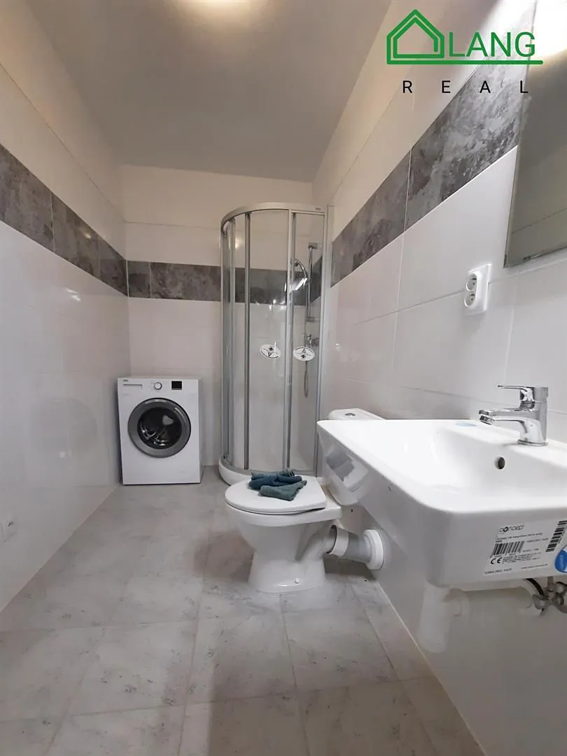 V nové koupelně je sprchový kout, pračka a umyvadlo se zrcadlem.