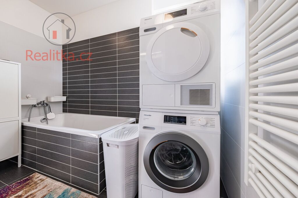 • Koupelna s vanou, dvoj-umyvadlem a přípojkou na pračku a sušičku