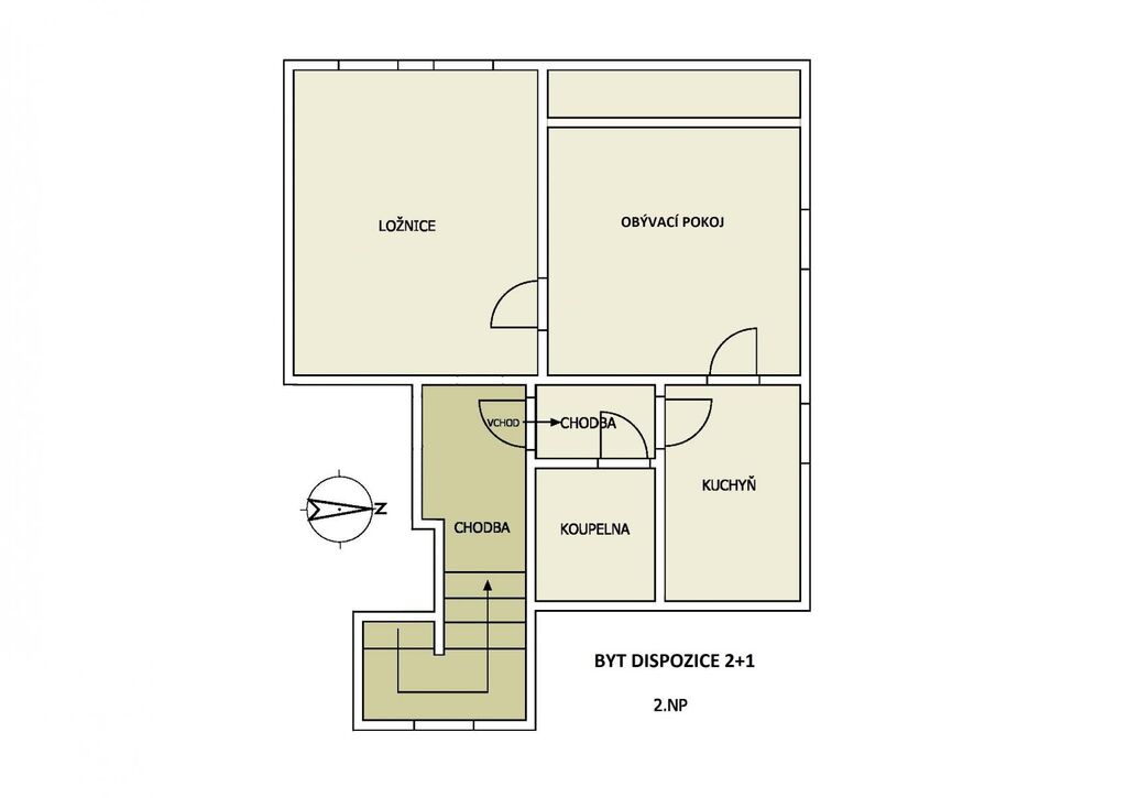 Dispozice bytu: předsíň, kuchyně, obývací pokoj, ložnice, koupelna se sprchovým koutem a WC.
