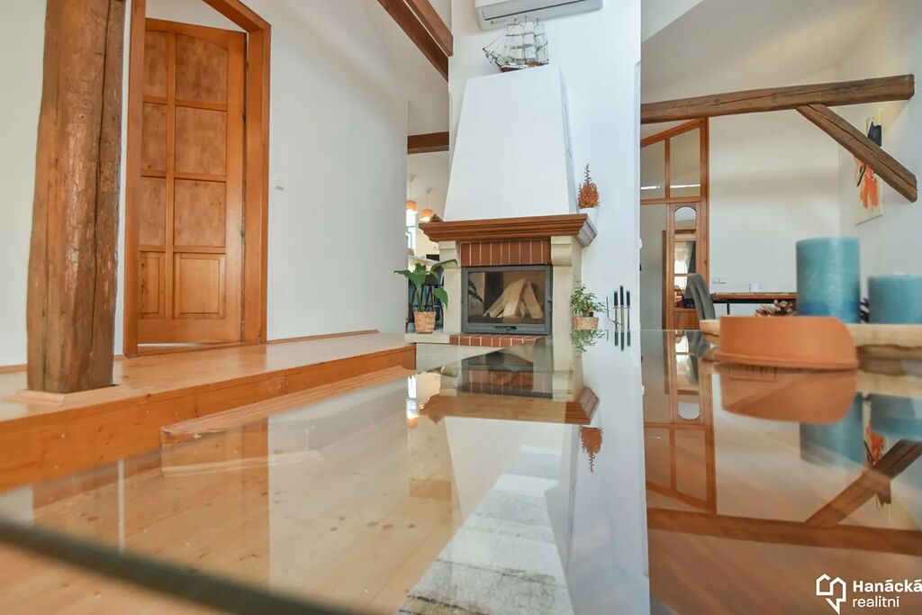 Byt působí velmi vzdušně a světlé prostory mu dodávají příjemnou atmosféru. Centrální část tvoří prostorný obývací pokoj s krbem, jídelní zónou a kuchyní na vyvýšeném pódiu, doplněnou o barový pult a samostatnou spižírnu. Kuchyně je plně vybavena spotřebiči (elektrická trouba, plynový sporák, lednice, myčka). Z kuchyně je vstup na balkon orientovaný do klidného vnitrobloku s posezením.