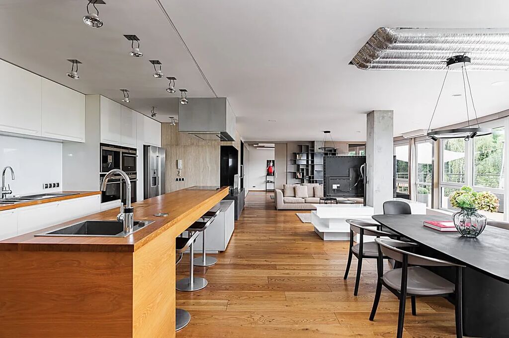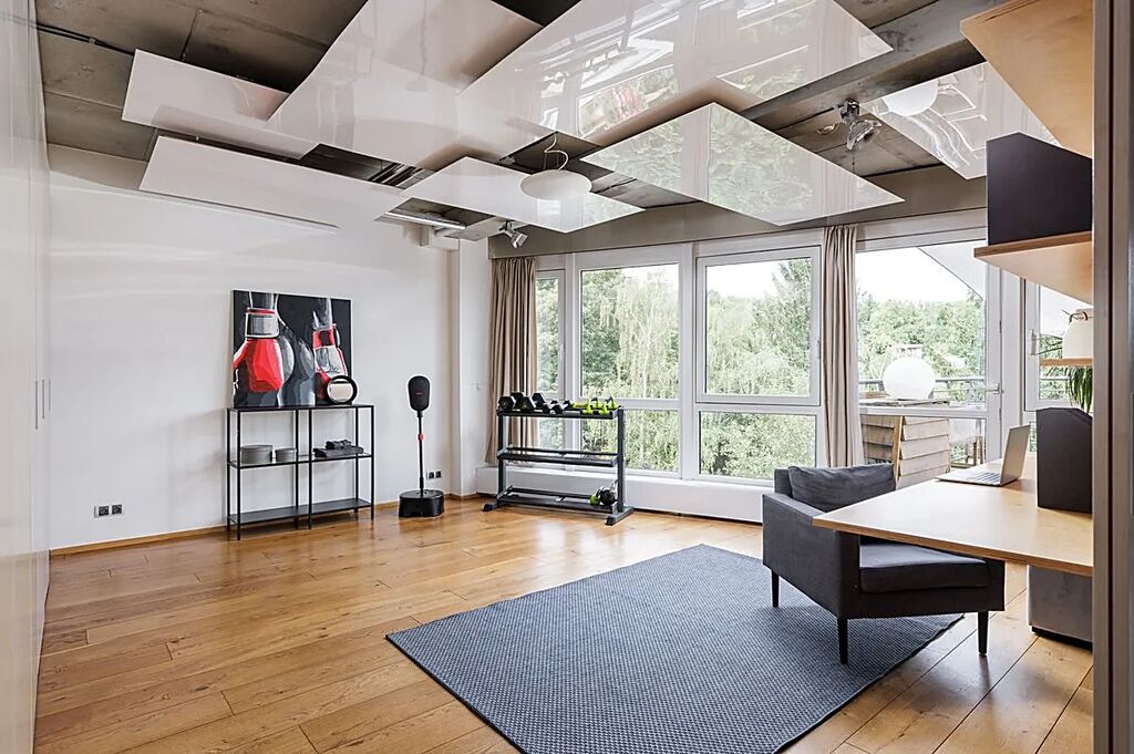 Prostorný byt 4+kk po pečlivé a nákladné rekonstrukci zahrnuje velký obývací pokoj s krbem, přilehlou 38metrovou západně orientovanou terasou s výhledem na lesy a zahradní osadu, dále kuchyni s jídelnou se vstupem na terasu. Byt dále disponuje třemi ložnicemi, z nichž jedna má vlastní koupelnu, druhá šatnu, dále je zde koupelna, prádelna, technická místnost a vstupní hala.