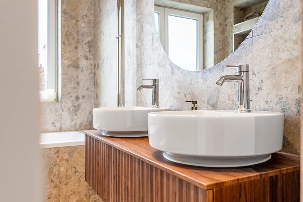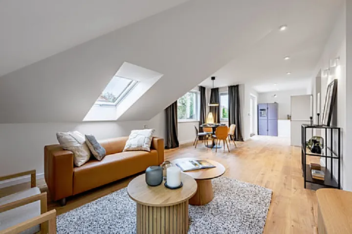 Standardem této jedinečné novostavby jsou dřevěné podlahy, podlahové vytápění, velkoformátové obklady, moderní trojskla a čistý design.