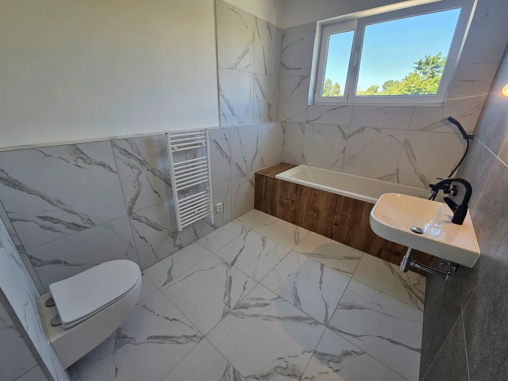 Pronájem úsporné novostavby RD o dispozici 4+kk včetně samostatné velkorysé garáže o celkové užitné ploše 137 m2 a pozemkem 290 m2. V přízemí domu se nachází 2 předsíně, obývací pokoj s kuchyní a špízí, 2 technické místnosti, v 1. patře naleznete 3 pokoje, velkorysou koupelnu a šatnu. Obývací pokoj se vstupem na zahradu má novou kuchyň včetně vestavěných spotřebičů.