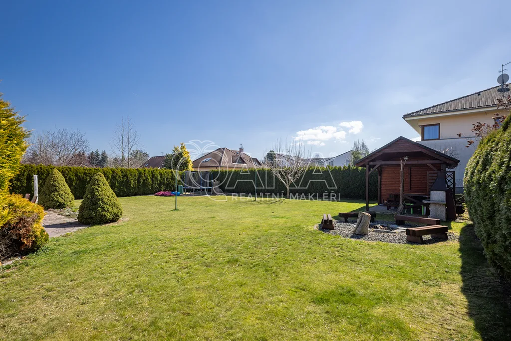 Zahrada je zatravněná se vzrostlými okrasnými keři a dřevinami. Nachází se na ní ohniště a zahradní domek nabízející kryté venkovní posezení. Dále je na zahradě vybudovaný zavlažovací systém.