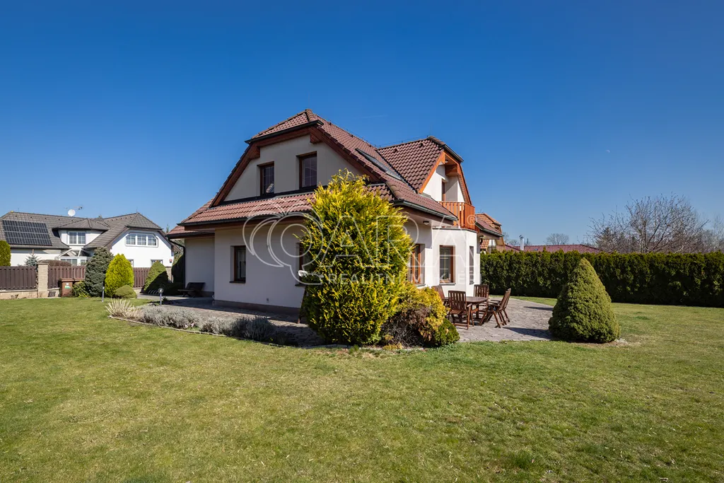 Dům z roku 2004 je dispozičně řešen jako 6+1 s garáží a je ve velmi dobrém stavu. Přízemí využíváno jako společenská zóna: obývací pokoj s krbem a navazující terasou, samostatná kuchyně s komorou, pracovna, hala se schodištěm, koupelna se sprchovým koutem a samostatné WC. V patře se nachází čistě soukromá část, kterou tvoří 4x ložnice (tři ložnice mají vstup na balkon), hlavní koupelna s vanou, sprchovým koutem a s WC, chodba a menší koupelna se sprchovým koutem a s WC. Posledním prostorem v domě je půda (úložný prostor pro lyže, kufry, sportovní vybavení a sezonní potřeby pro celou rodinu).