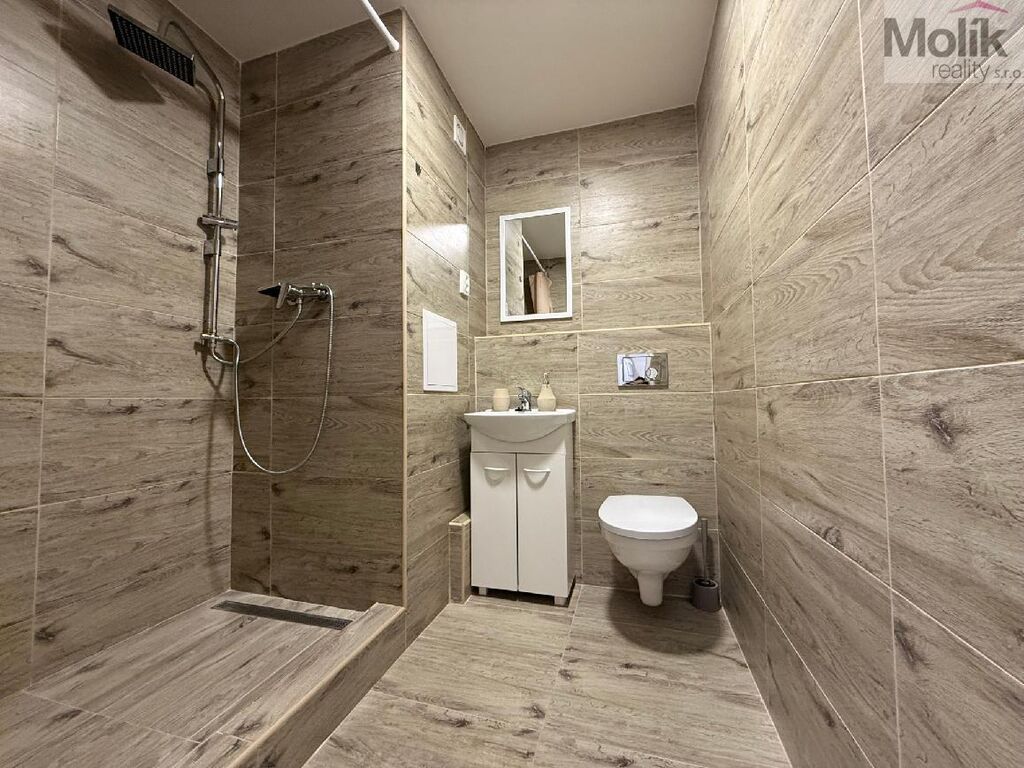 Nabízený byt prošel rekonstrukcí - nová kuchyňská linka s elektrickým sporákem, zděná koupelna s koupelnou (vyzděný sprchový kout, umyvadlo se skříňkou, keramický obklad a dlažba).