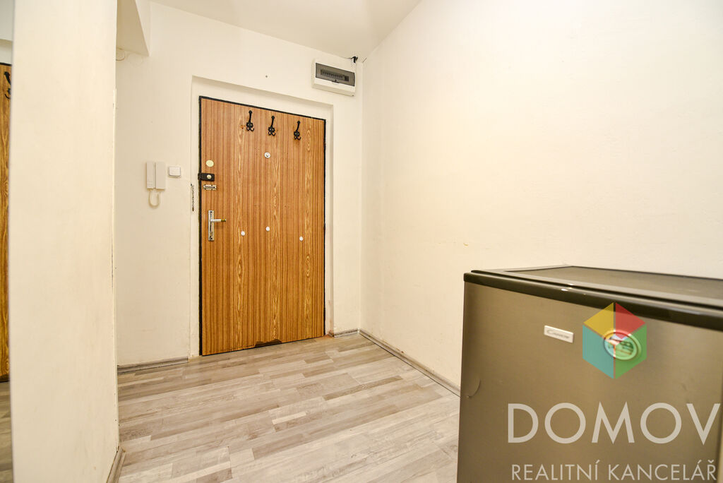 Vstupní chodba vede do prostorné koupelny s vanou a dále do světlého obytného prostoru s kuchyňským koutem. V této místnosti je dostatek místa pro jídelní stůl, gauč i televizní kout. Z okna této místnosti vidíte přes zahradu do korun stromů.