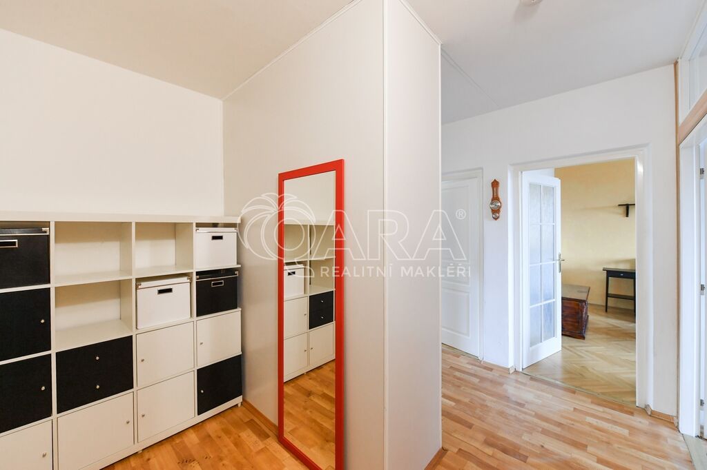 Nabídka pronájmu udržovaného bytu o dispozici 3+1/L, 84 m2, ul. Bělinského, Praha 10 - Hostivař. Byt je umístěn ve 4. NP zrekonstruovaného panelového domu s výtahem. Byt o výměře 76 m2 je vyřešen velmi prakticky a tvoří jej prostorná chodba, obývací pokoj, ložnice se vstupem na lodžii (5 m2), dětský pokoj, kuchyně s jídelním koutem a koupelna se sprchovým koutem a WC. Byt se pronajímá částečně zařízen (viz fotografie). Dále byt disponuje množstvím úložných prostor. Byt je v udržovaném stavu – plastová okna, na podlaze parkety a PVC, obložené jádro. Byt je orientován na jih (2x ložnice) a na sever (obývací pokoj a kuchyně). K bytu dále patří sklepní kóje (3 m2). Domácí mazlíčci a kuřáci nejsou vítáni.