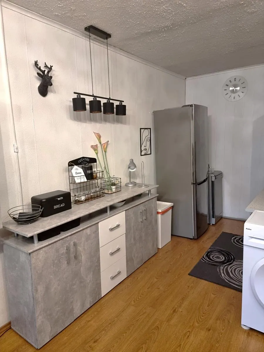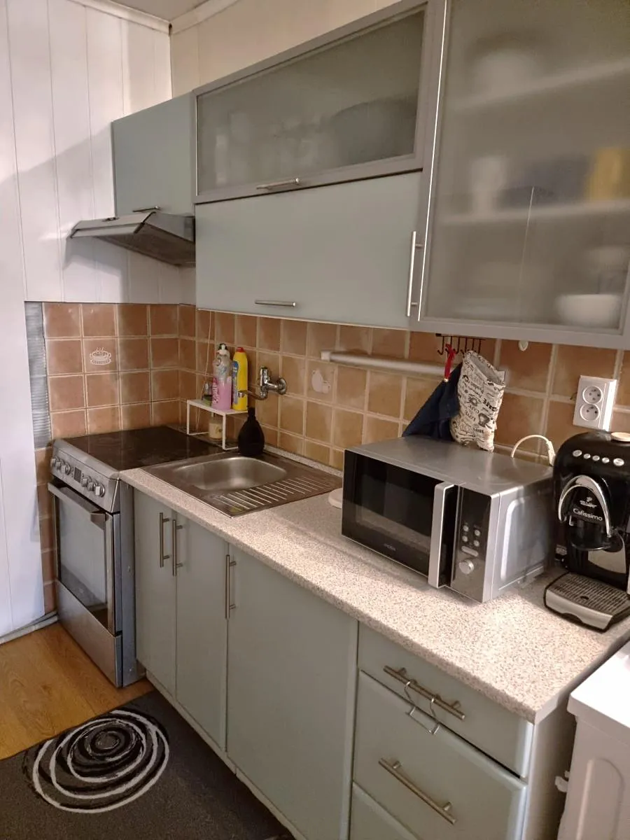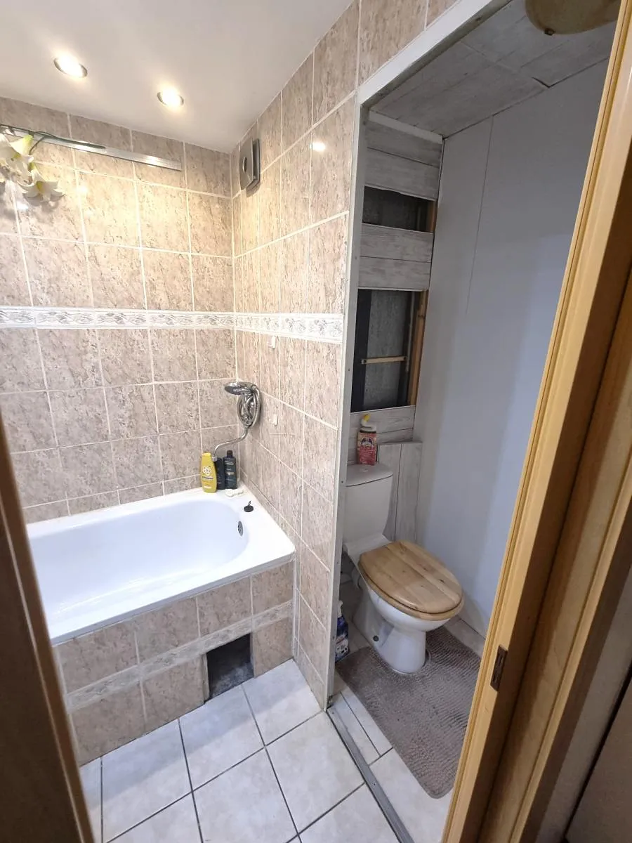 Je zde menší kuchyňská linka s elektrickým sporákem.. V koupelně je vana obložená moderními dlaždicemi a oddělena příčkou od toalety.