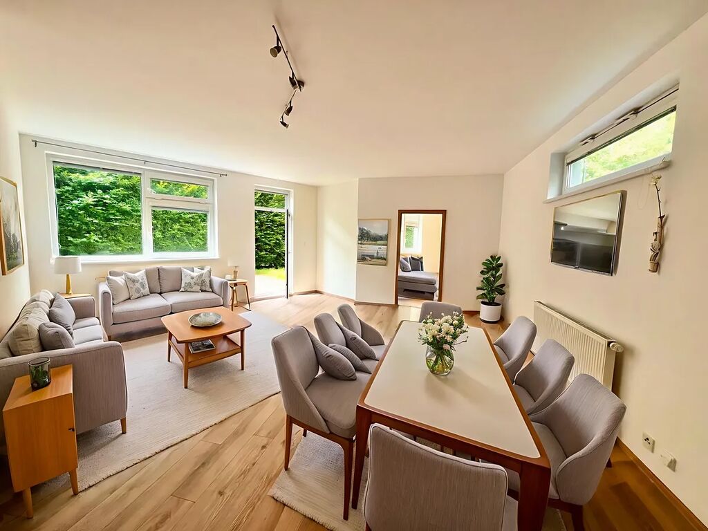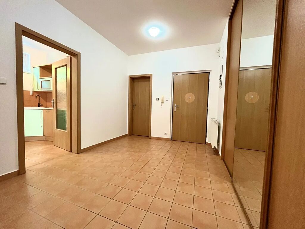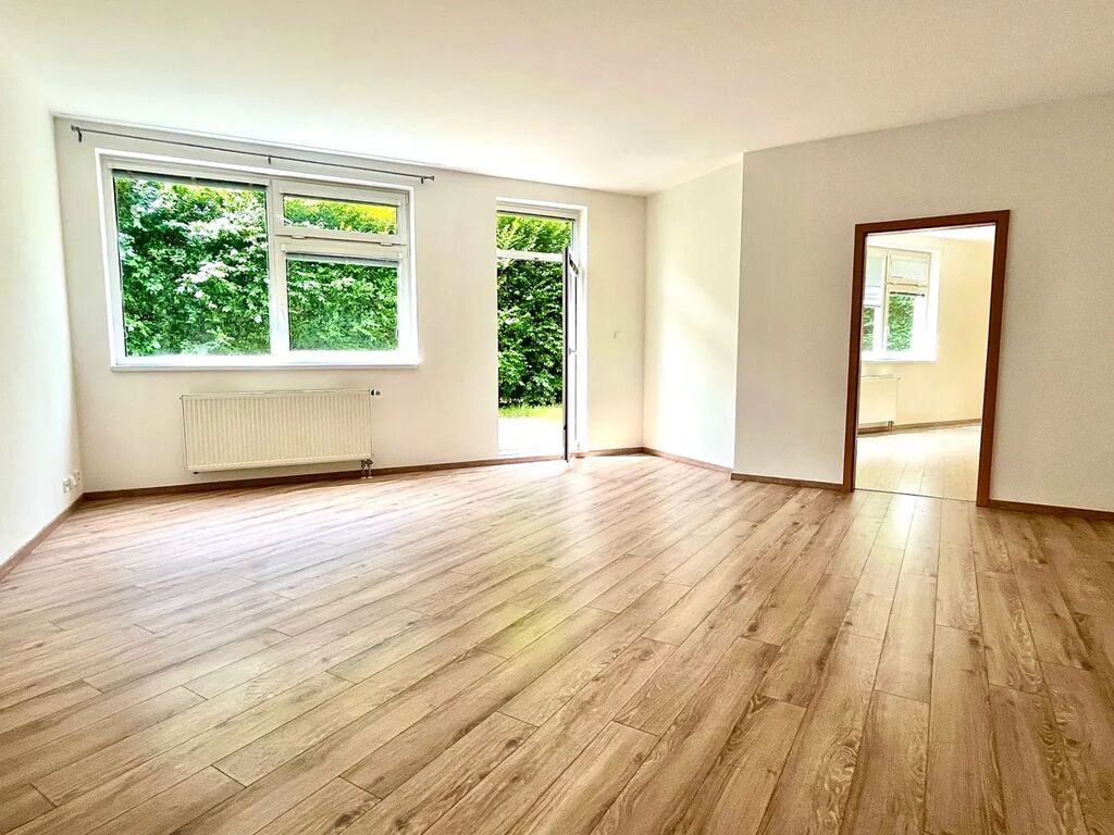Dispozice bytu nabízí vzdušný obývací prostor s kuchyňským koutem (45 m2) a vstupem na terasu s předzahrádkou. Dva samostatné pokoje, prostorná předsíň s vestavnými skříněmi, koupelna s oknem, vanou a WC a dostatkem místa pro pračku i sušičku. Kuchyň vybavena spotřebiči myčka, digestoř, varná deska a el. trouba. Podlahy plovoucí (z r. 2021), dlažba. Ústřední vytápění i ohřev vody.