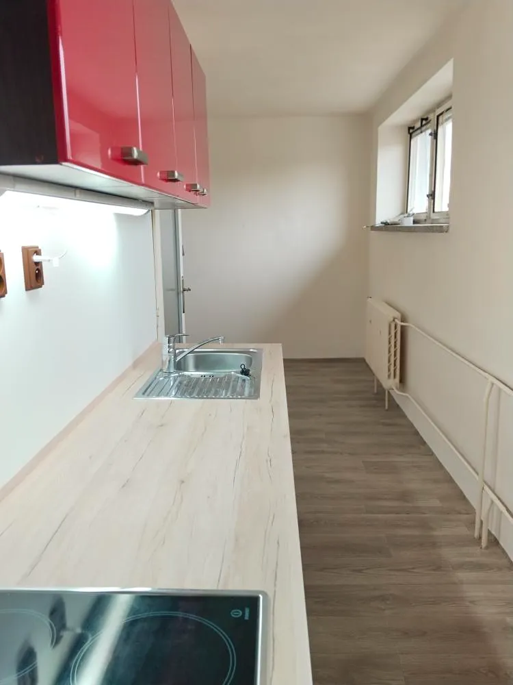 V bytě je nový sprchový kout , umyvadlová skříňka, kuchyňská linka se sporákem a myčkou, přípojka na pračku. Po celém bytě je nově položená podlaha z PVC, nové vchodové dveře, nové WC a k bytu náleží sklep o velikosti 8m².
