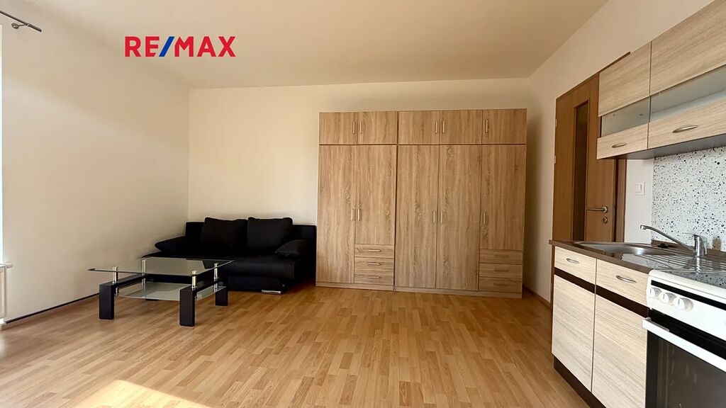 Byt je zařízený - obývací pokoj s plně vybavenou kuchyňskou linkou (jako jsou trouba, varná deska, malá lednice); jídelní stůl se židlemi, komoda, rozkládací pohovka, velká skříň, televize, konferenční stolek; skříň v chodbě, dále koupelna se sprchovým koutem, WC a pračkou. Nechybí tady ani balkon s výhledem do klidného vnitrobloku.