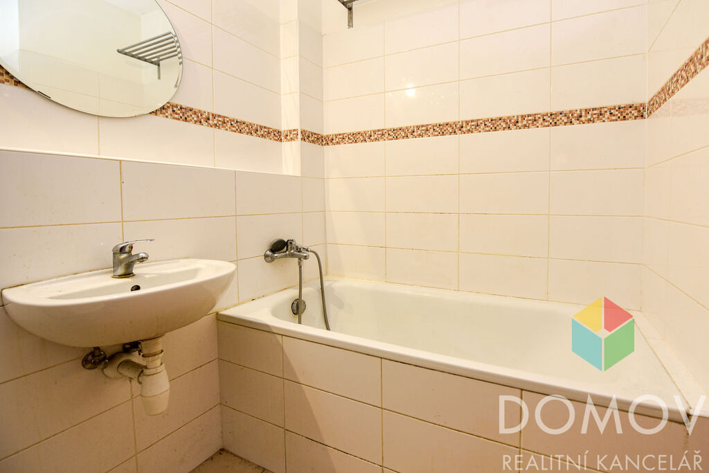 Na obývací prostor s kuchyňským koutem navazuje balkon o velikosti 1,8 m2. Na fotkách je nábytek předchozího nájemce, nyní je byt prázdný. V koupelně s toaletou je dále vana a umyvadlo. Kuchyňský kout je vybaven sklokeramickou varnou deskou, troubou adigestoří. Okna jsou plastová, na podlaze lamino.