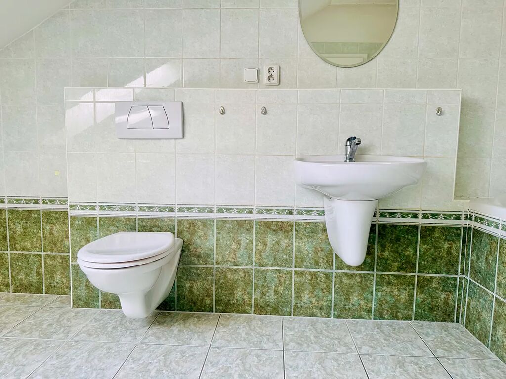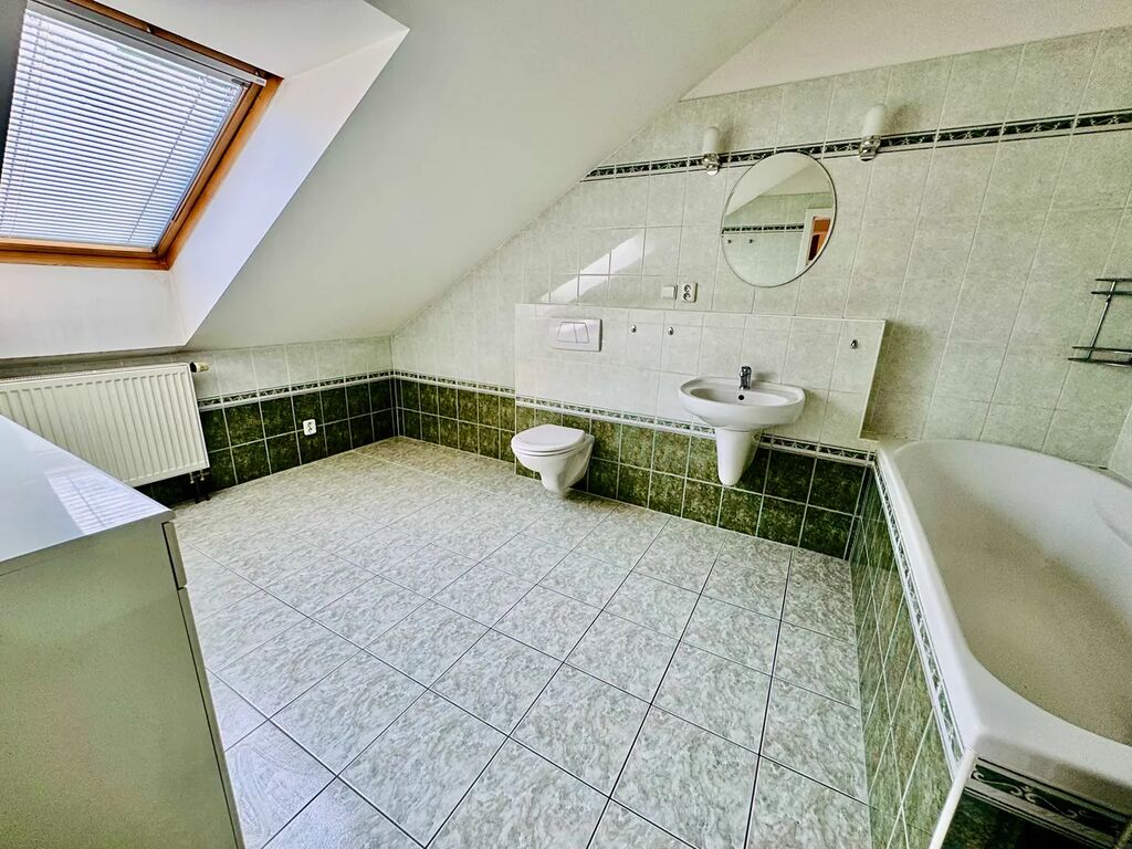 Z haly je vstup do velké koupelny s vanou, umyvadlem, toaletou, topným žebříkem a místem na pračku, případně i sušičku. Lze zde dobudovat sprchový kout, světlo a větrání zajišťuje okno. Dětský pokoj je vybavený nábytkem na míru pro dvě děti – lze samozřejmě vystěhovat.