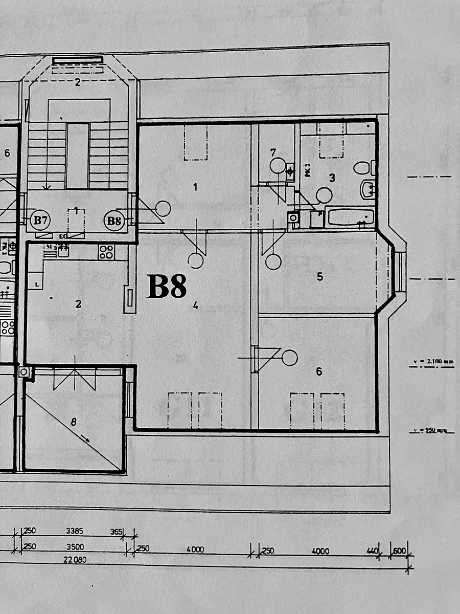 Dispozice bytu: vstupní prostorná hala, kde jsou vestavěné skříně, tuto místnost vzhledem k velikosti a oknu lze přebudovat na pokoj. Obývací prostor je velikostně velkorysý s navazující další částí kde je kuchyně a prostor na jídelnu.