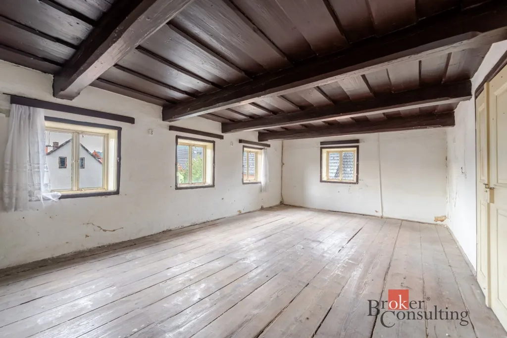 V patře je prostor vhodný pro vybudování pokojů k ubytování. Stejný potenciál nabízí i půdní část, která je zatím nevyužitá. Po citlivých úpravách může celková užitná plocha domu dosáhnout přibližně 380 m², což vytváří velmi dobrý základ pro menší penzion nebo kombinaci bydlení a podnikání. Některé části objektu budou vyžadovat rekonstrukci, což zároveň umožní novému majiteli přizpůsobit celý projekt svým představám a stylu – ať už jde o obnovu hospody, rozšíření ubytování nebo vytvoření vícegeneračního bydlení.