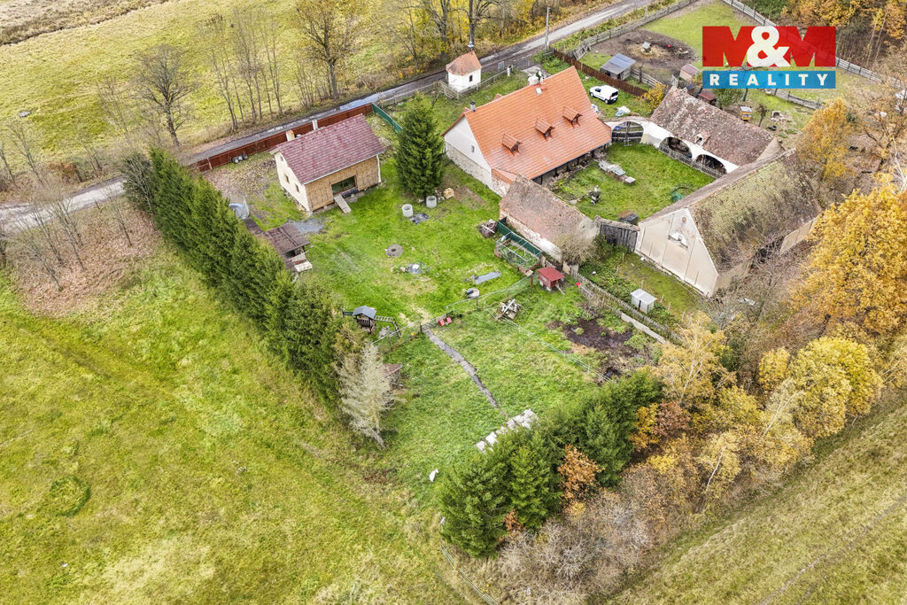 Součástí prodeje je pozemek o výměře 1 774 m² a navazující pronajatý pozemek cca 5 000 m² s ohradou - ideální pro chov koní nebo drobných hospodářských zvířat. Na pozemku se nachází přístřešek pro koně a dřevěná kůlna.