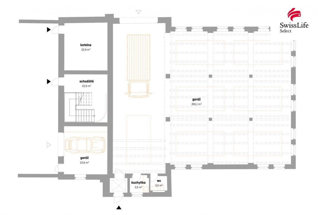 Budova má tři samostatné vstupy hlavní sekční vrata (šířka 5 m, výška 6 m), reprezentativní vstupní schodiště a přístup přes výtah s oboustranným výstupem v přízemí.
