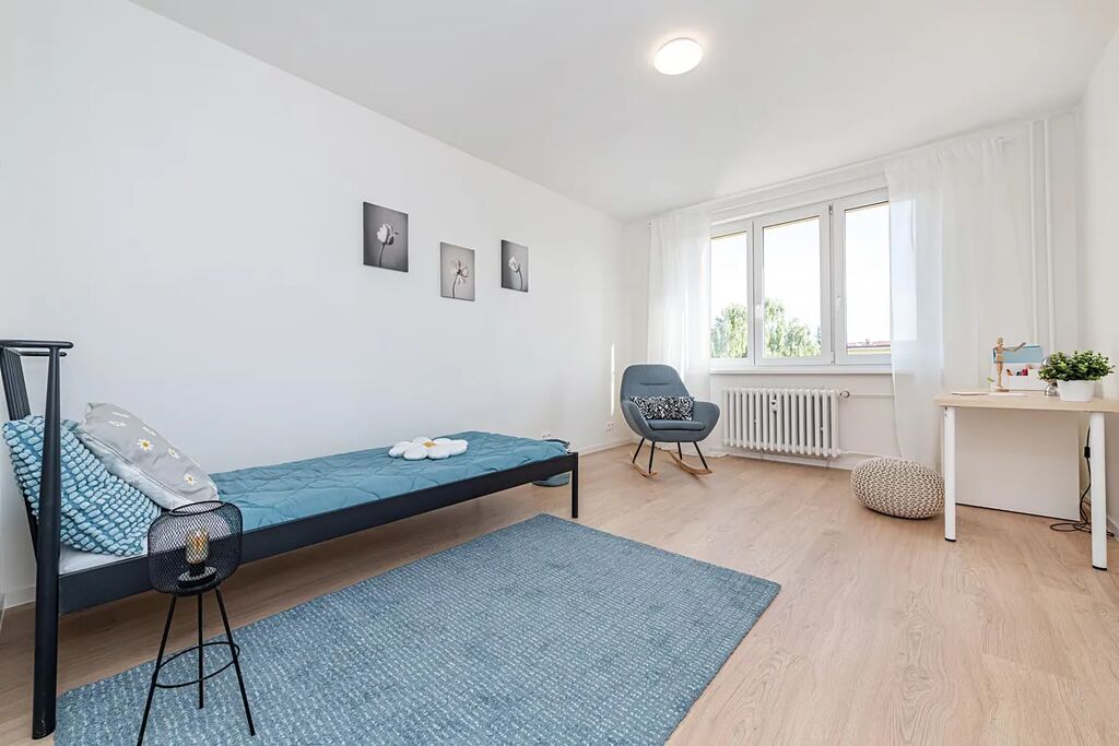 Dispozice zahrnuje prostorný obývací pokoj s kuchyňským koutem a vstupem na lodžii o velikosti 3 m², tři samostatné pokoje vhodné jako ložnice, dětské pokoje či pracovna, přičemž hlavní ložnice má vlastní lodžii o stejné velikosti. Součástí bytu je koupelna se sprchovým koutem, samostatná toaleta, technická místnost a velkorysá vstupní chodba s možností vytvoření úložných prostor. K bytu náleží sklepní kóje o výměře 2 m². K dispozici je ke společnému užívání také kolárna.