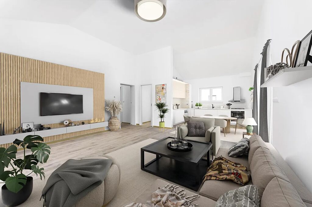 – dispozice domu je 5+kk s prostorným obývacím pokojem, jenž je otevřen celý do krovu