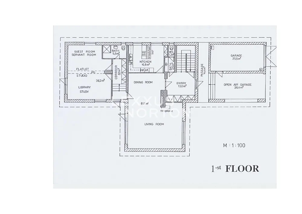 Interiér tvoří vstupní chodba, obývací pokoj s jídelní částí, plně vybavená kuchyň, 5 ložnic přičemž jedna má svou vlastní koupelnu, 4 koupelny, 2 šatny, prádelnu a místnost, kterou lze využít jako hernu, fitness nebo podle svých potřeb. K domu náleží zahrada a 4 parkovací místa.