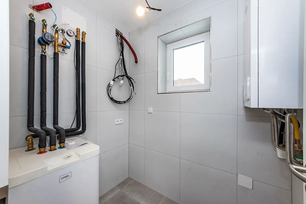 Budova má systém teplovodního podlahového topení, zdrojem tepla kondenzační plynový kotel.