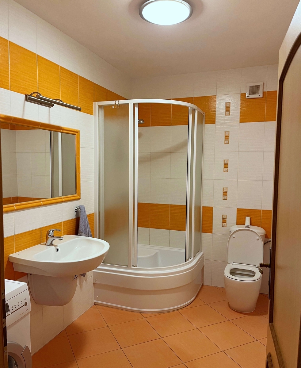 – koupelna se sprchovým koutem, WC a pračkou