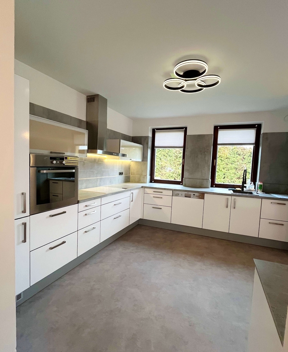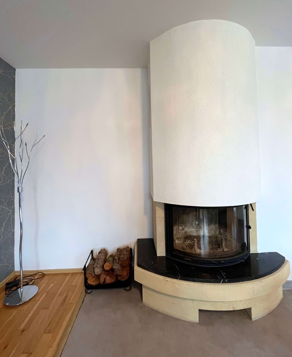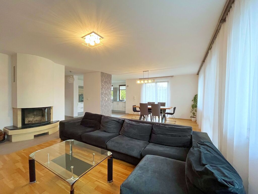 – obývací pokoj s krbem propojený s plně vybaveným kuchyňským a jídelním koutem