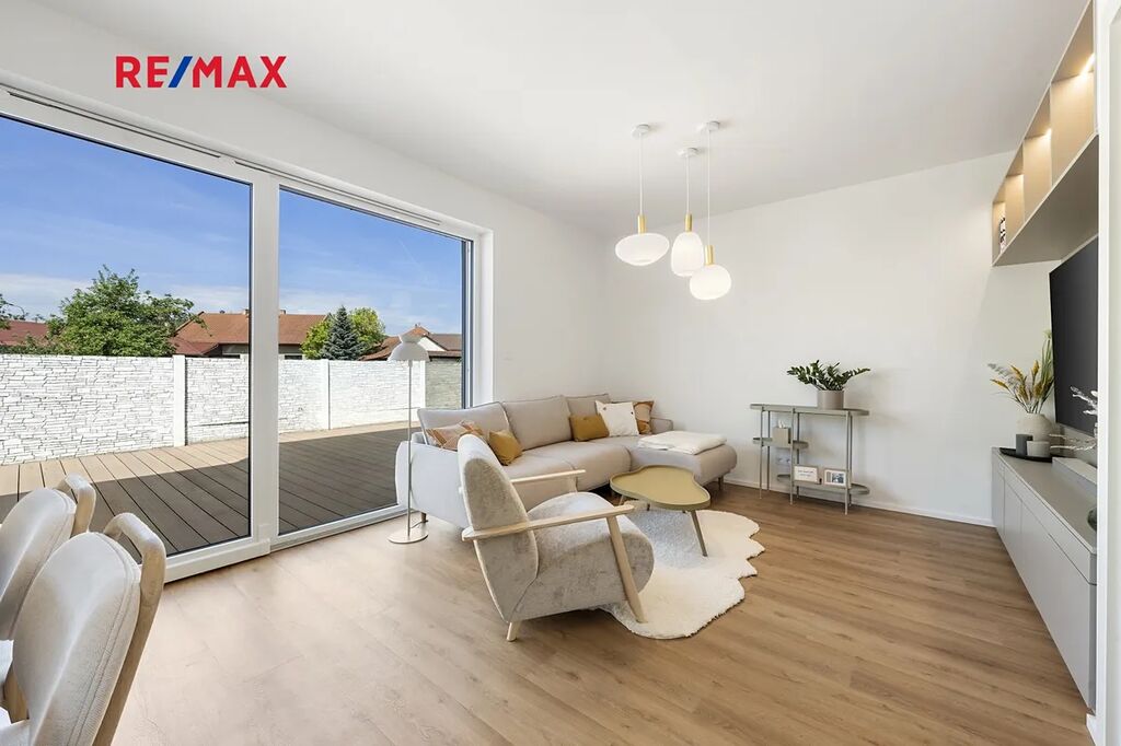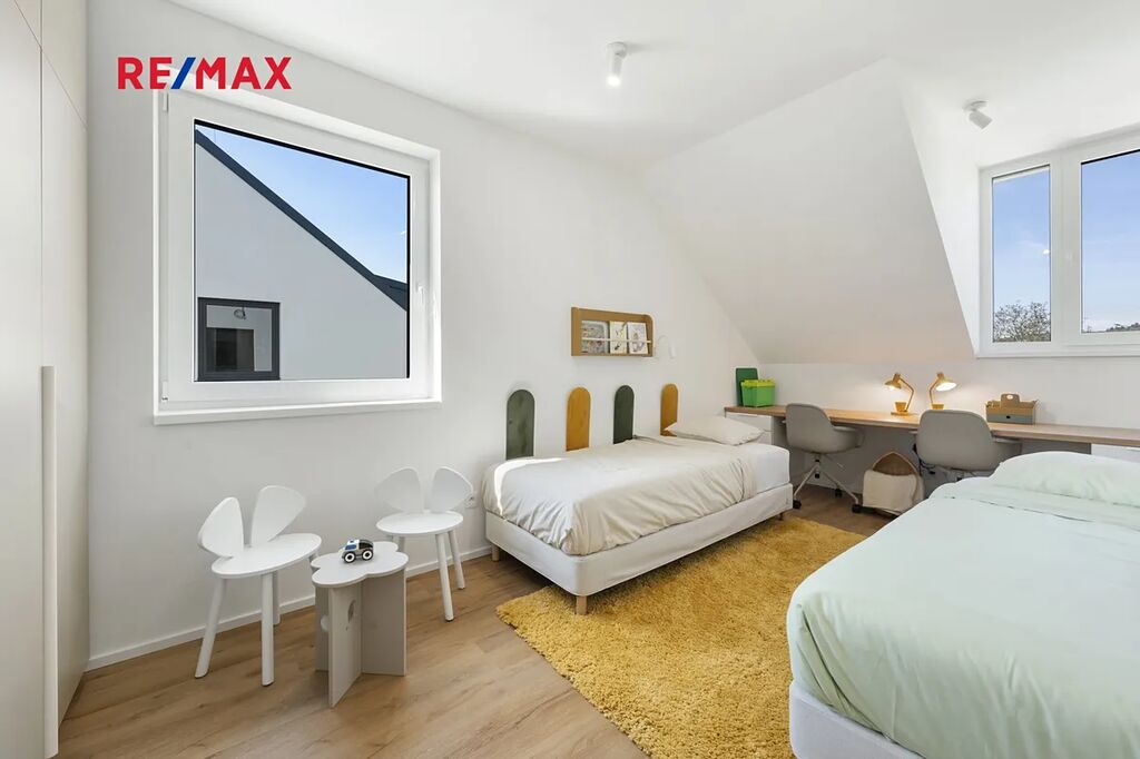 Každý dům nabízí do detailu promyšlenou dispozici 5+kk - 4 samostatné pokoje, obývací pokoj s kuchyňským koutem, 2 koupelny a technickou místnost. Venku posedíte na terase či na zahradě a před domem zaparkujete dva své vozy.
