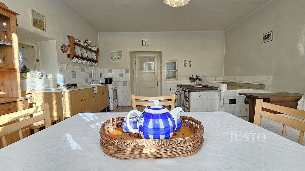 Příběh tohoto místa dávají tušit už samotná vrátka do uzavřeného dvorku. Když vstoupíte, ucítíte klid, bezpečí a zákoutí pro letní posezení i odpočinek. V bytové části chalupy najdete dvě průchozí místnosti, kde jsou doslova zachyceny vzpomínky na společně strávené večery i rodinné oslavy. Prostorná kuchyně o výměře 20 m² s tradiční pecí a vyhřívárnou navodí atmosféru opravdového domova, kde může vznikat ta nejlepší domácí kuchyně. Na koupelnu s vanou a toaletou navazuje předsíň, která dává prostoru útulný rámec.