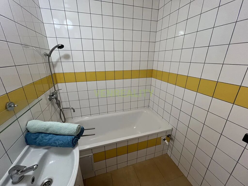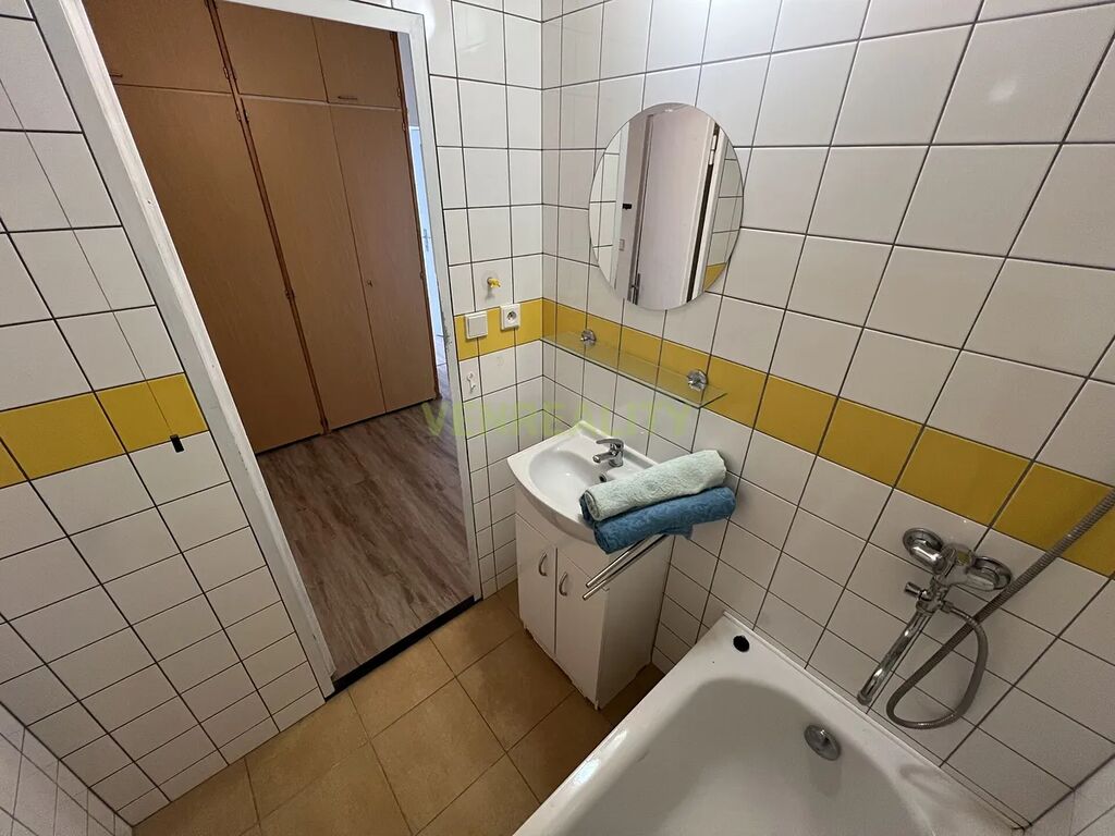 Bytové jádro je v koupelně obloženo dlažbou, nově je položena podlahová krytina.