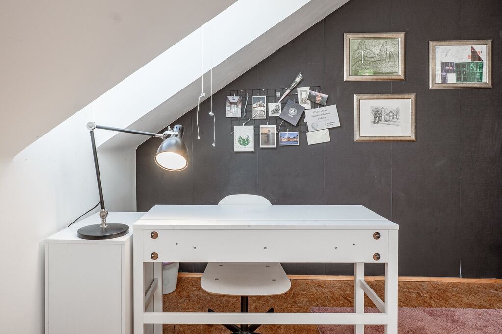 V patře se nachází dva dětské pokoje, každý s vlastní šatnou, a prostorná ložnice s dostatkem místa i pro pracovní kout. Na chodbě je pak samostatné WC.