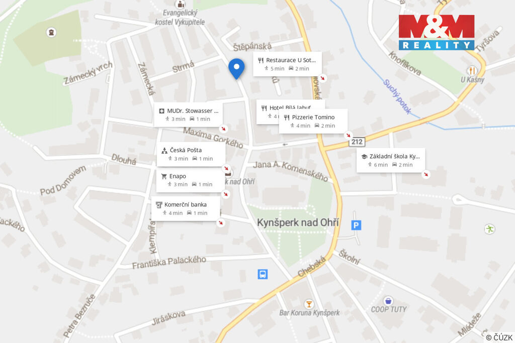 Kynšperk nad Ohří leží v malebném údolí řeky Ohře, obklopený přírodou a s dobrou dopravní dostupností. Najdete zde kompletní občanskou vybavenost – obchody, školu, školku, lékaře i sportovní areály. Dominantou města je kostel sv. Petra a Pavla a zámek Kynšperk. Do Sokolova se dostanete za cca 10 minut, do Karlových Varů asi za půl hodiny a na hranice s Německem (přechod Plesná / Bad Brambach) za přibližně 20 minut.