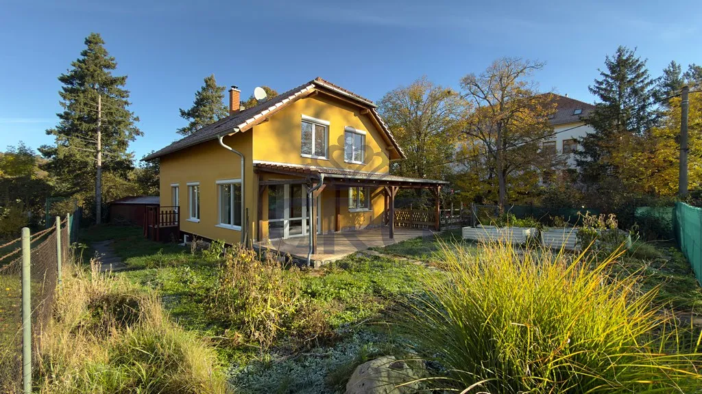 Po betonovém schodišti vejdeme do prvního patra, kde se ocitneme v hale o výměře cca 9 m2, ze které je vstup do ostatních místností na tomto patře. Dominantou celého domu je obývací pokoj spolu s kuchyní o celkové výměře cca 37 m2, který je nejen velmi prostorný, ale i slunný díky množství oken, nacházejících se v obou těchto místnostech. V obývacím pokoji jsou funkční krbová kamna, která dokáží zajistit vytápění zbylých obytných místností v domě. Kuchyně je vybavena kuchyňskou linkou s vestavěnými spotřebiči konkrétně lednička s mrazákem, myčka, mikrovlnná trouba, pečící trouba a plotýnka s digestoří. Z obývacího pokoje spojeného s kuchyní je vstup na velkou zastřešenou terasu o výměře cca 29,6 m2, která plynule navazuje na zahradu vedoucí podél domu. Na patře je i šatna o výměře cca 5,1 m2, samostatné WC s umyvadlem o výměře cca 1,9 m2, dále koupelna o výměře cca 9 m2, která disponuje masážním sprchovým koutem, WC s bidetem, otopným žebříkem, umyvadlem se zrcadlem včetně umyvadlové skříňky. Další obytnou místností je pokoj o výměře cca 12,6 m2, který může sloužit jako ložnice či pracovna. V pokoji jsou francouzské dveře s výstupem do zahrady.