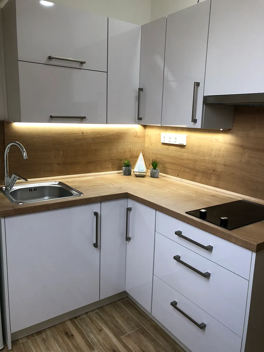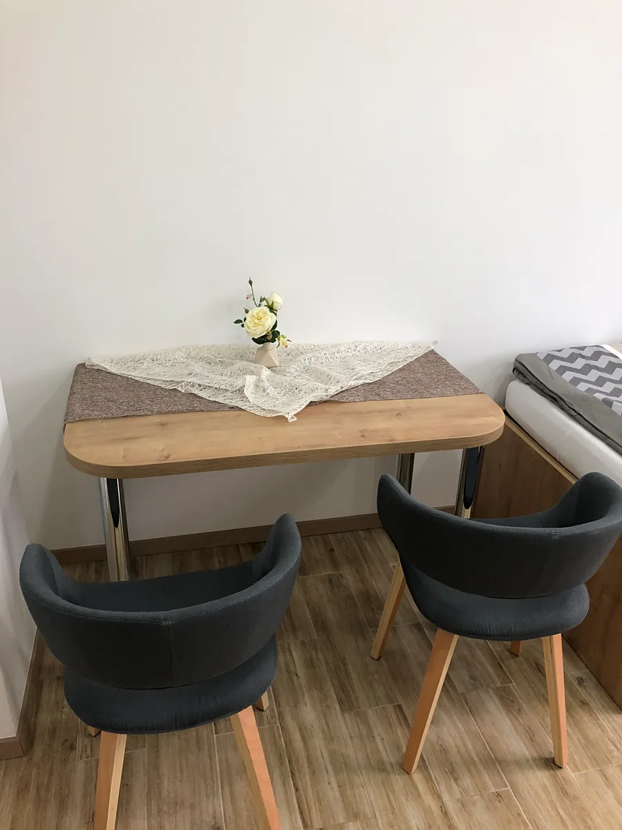 Dispozice a vybavení bytu: Kuchyňský kout se spotřebiči (lednice, varná deska, digestoř). Velkou výhodou je klimatizace. Dále je v pokoji vestavěná skříň, stůl, 2 židle, TV a dvě postele s kvalitní matrací s polštářem, přikrývkou, plachtou a povlečením. Koupelna se sprchovým koutem a WC.