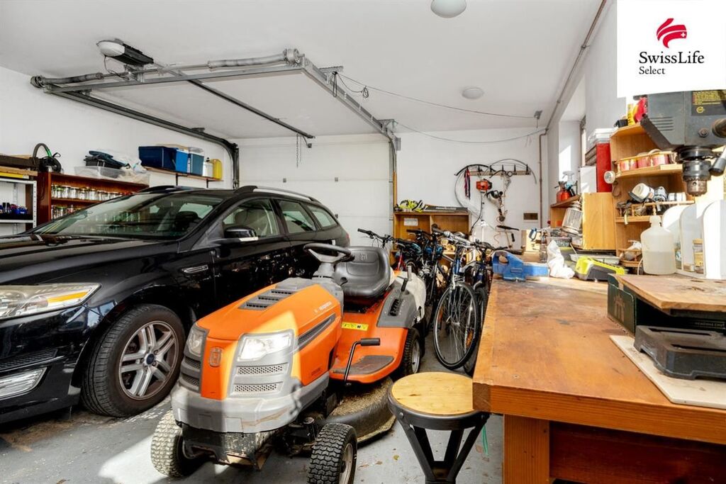 Garáž s přímým vstupem do interiéru je také vytápěná a nabízí stání pro automobil i zahradní techniku, tři masivní pracovní stoly a dostatek prostoru pro jakékoli vaše tvoření.
