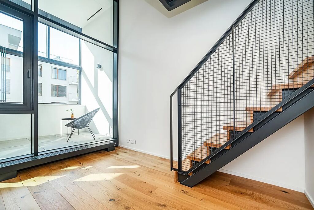 Byt disponuje podlahovou plochou 64,1 m2 a díky dvěma galeriím a zasklené lodžii (dalších 20 m2 navíc) působí opravdu velmi stylově a především světle a vzdušně.