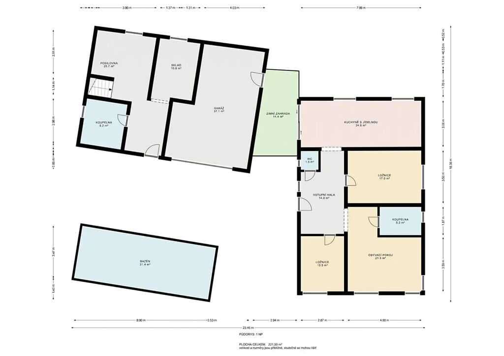 - Kuchyní s jídelním stolem a vstupem do zimní zahrady (14,4 m).