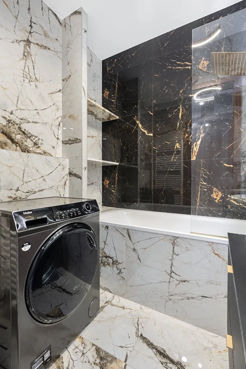 Koupelna s mramorovým obkladem nabízí komfort díky vaně, úložné skříni a pračce se sušičkou.