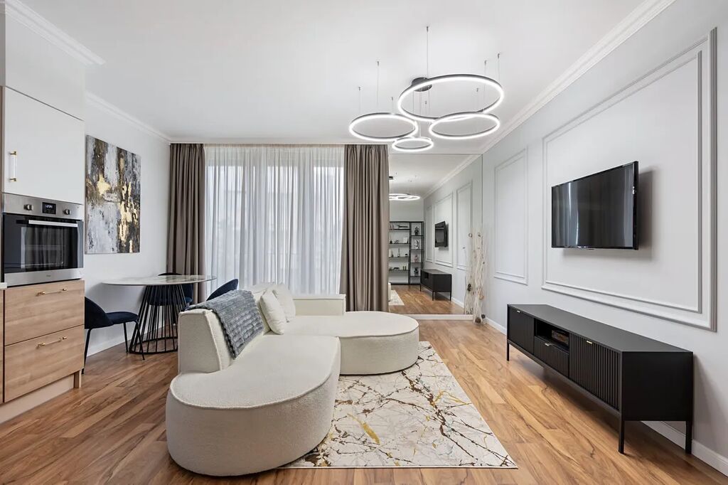 Byt spojuje nadčasovou eleganci s moderními prvky – mramorové detaily, designová svítidla, kvalitní nábytek a textilie.