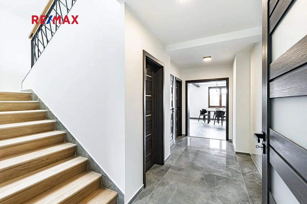 V patře se nachází další ložnice s balkonem, koupelna s vanou, praktický kumbál a tři další místností. V jedné z nich je navíc příprava na druhou kuchyni – ideální pro dvougenerační bydlení nebo při rozdělení domu na dvě bytové jednotky.
