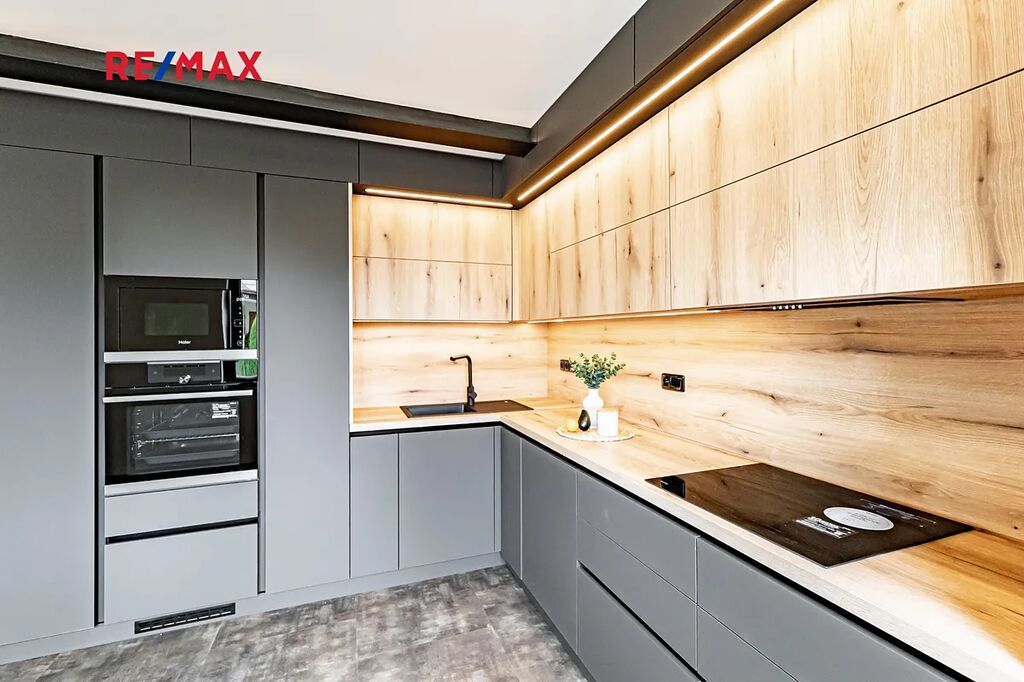 První nadzemní podlaží nabízí elegantní ložnici s vlastním balkonem, koupelnu se sprchovým koutem, samostatné WC a hlavní obytnou část propojenou se stylově řešenou kuchyní a jídelnou. Samozřejmostí jsou špičkové spotřebiče, vestavěná vinotéka a praktická spižírna.