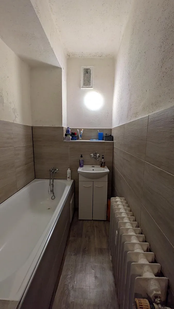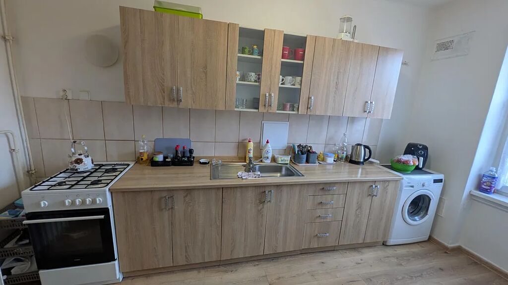 V kuchyni je kuchyňská linka s plynovým sporákem. V koupelně je vana a umyvadlová skříňka se zrcadlem, WC je odděleno.